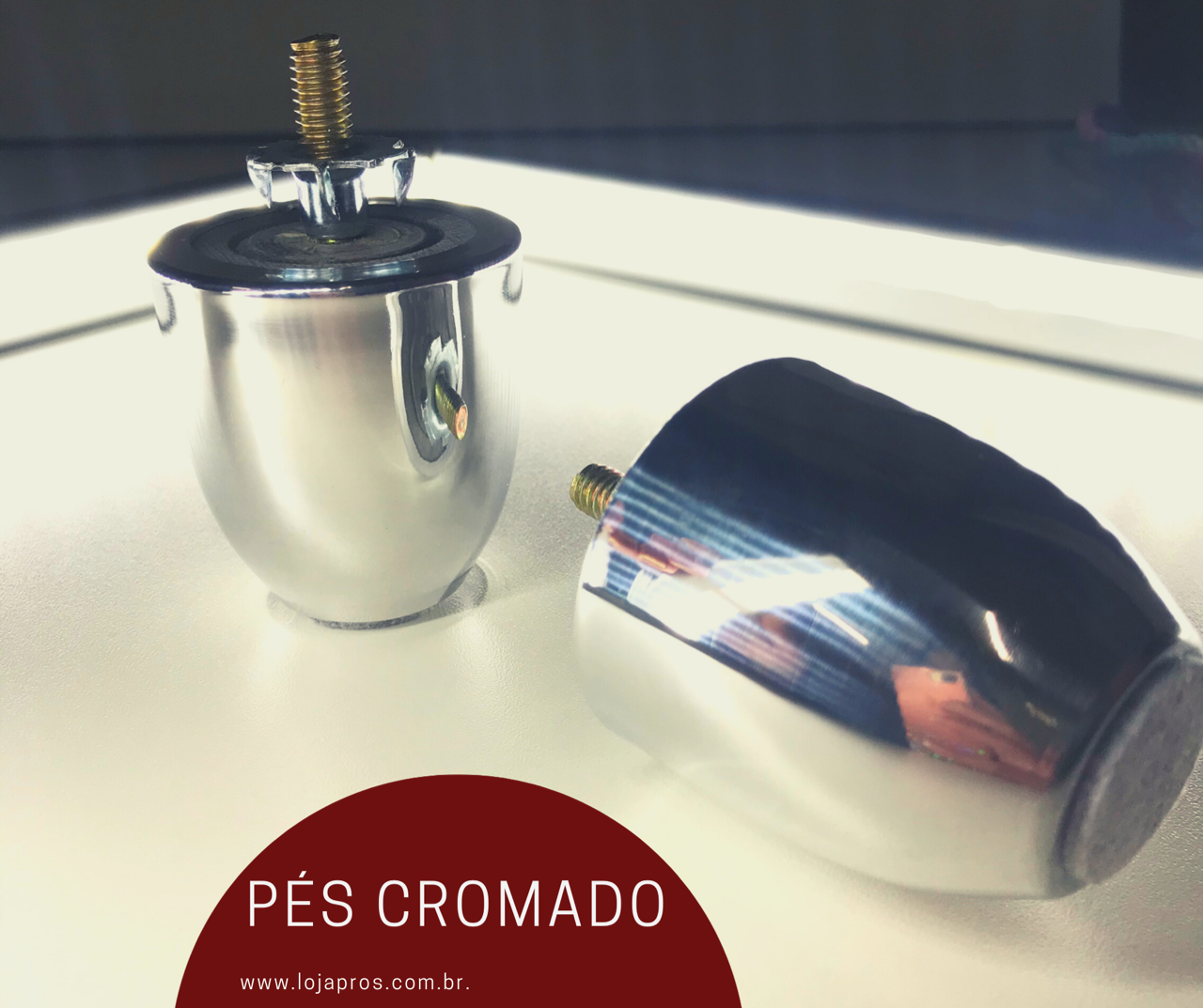 Pés com rosca 5/16 maciço de madeira, revestido com capa de metal cromada.