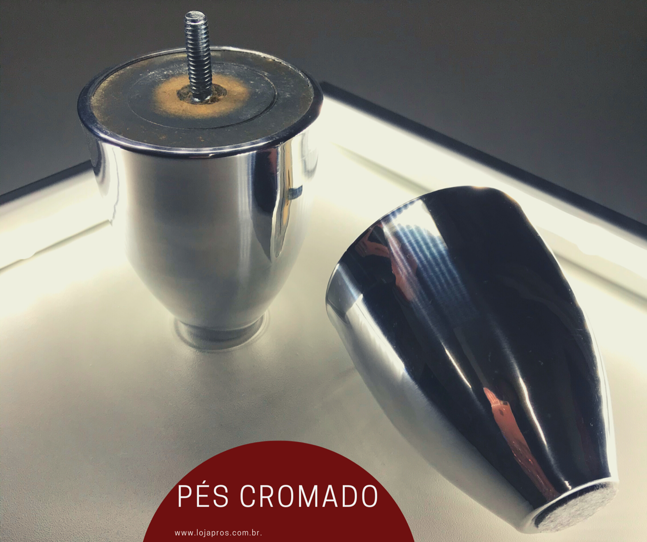 Pés com rosca 5/16 maciço de madeira, revestido com capa de metal cromada.