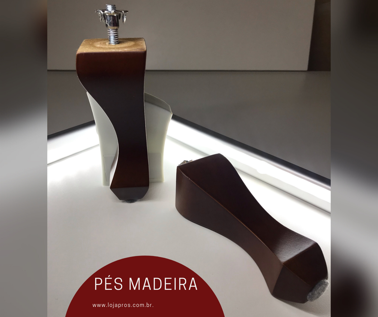 Pés com rosca 5/16 maciço de madeira. Com feltros na extremidade para não danificar o seu chão! VENHA CONFERIR