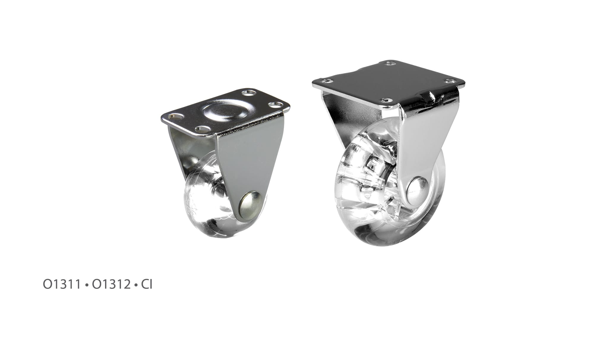 • Rodízio em poliuretano com base fixa • Diâmetros: 35 e 50 mm • Acabamento: cromado / incolor